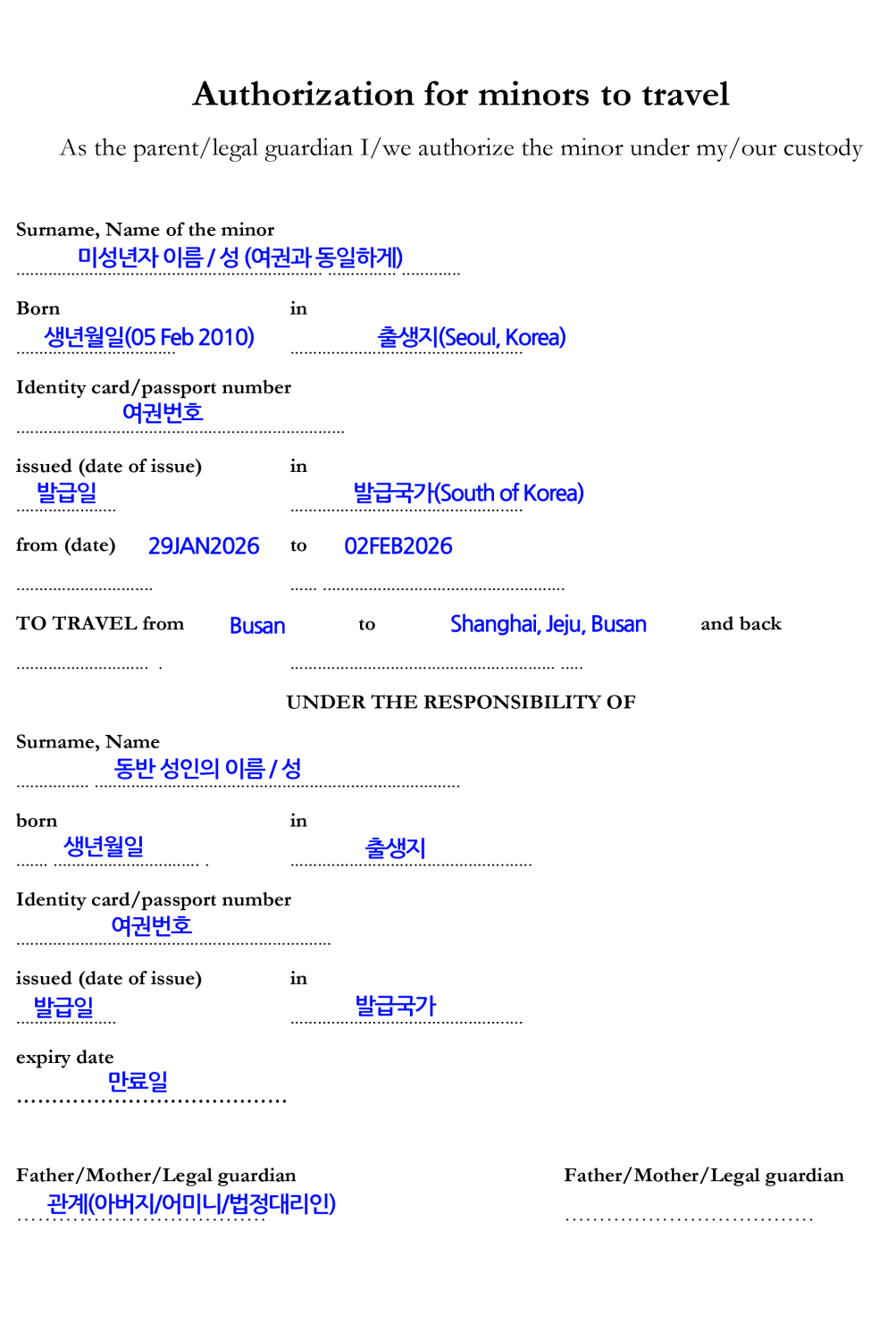 미성년자의 부모가 서명한 여행 허가 공증 서류 : 각 선사에서 특별한 양식을 제공하지 않는 경우, 아래 내용을 포함한 공증 서류를 준비해야 합니다.