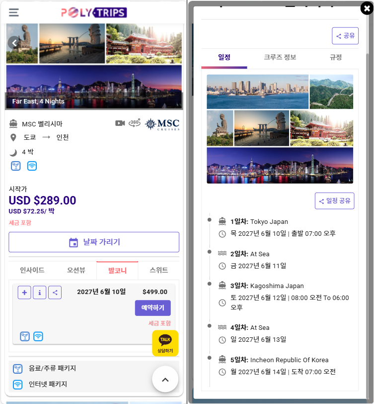 • 사진의 지도나 출항일자 옆에 있는 [ i ]를 클릭하면 상세 일정을 확인할 수 있습니다.