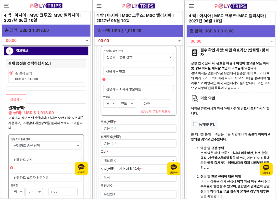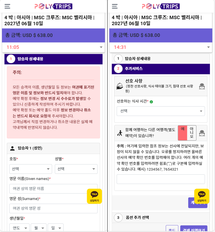 • 결제 또는 홀드가 완료된 이후의 정보 변경은 반드시 카카오톡 상담하기로 요청해주셔야합니다.(⚠️MSC의 경우 직접 수정하신 내용이 선사에는 반영되지 않습니다.)
