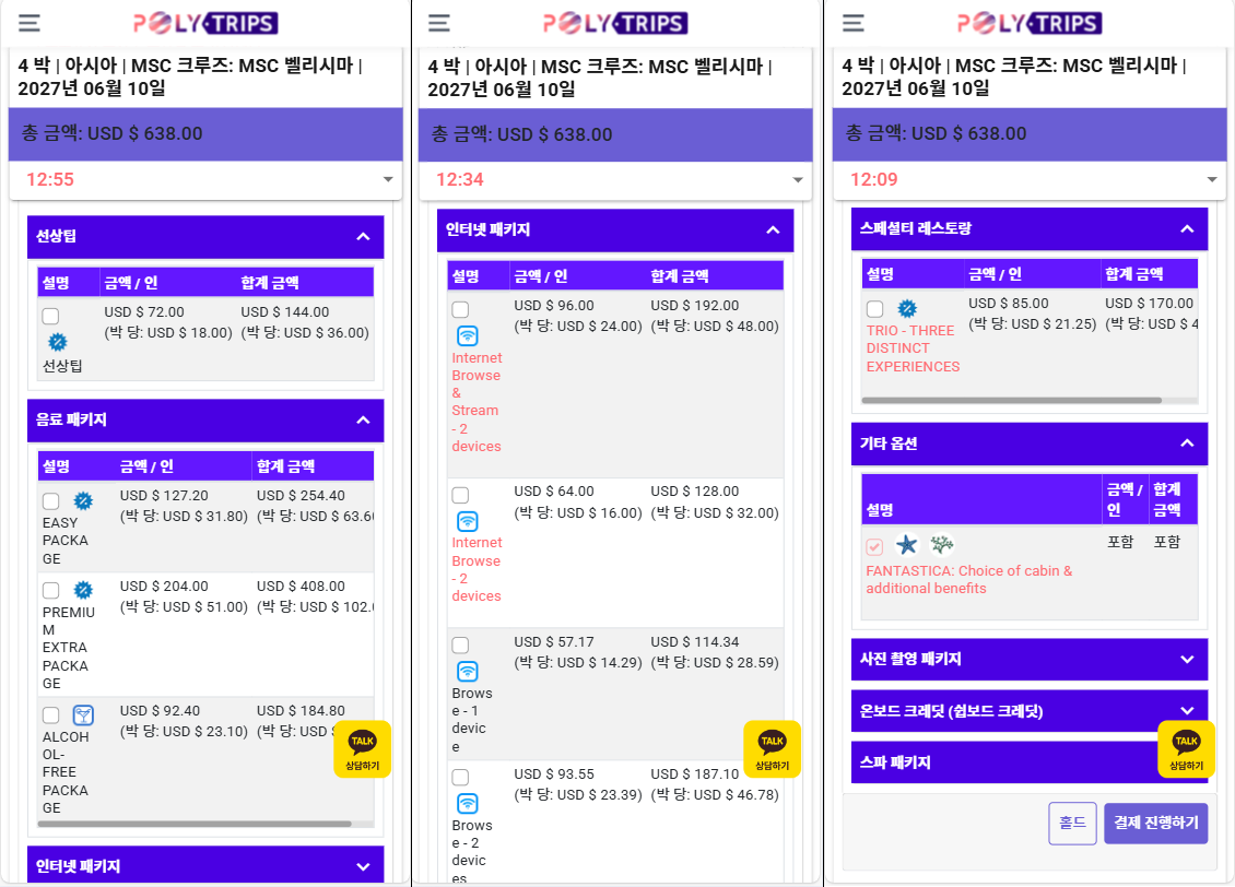 예약이후 탑승일 3일 전까지 추가 패키지의 사전 예약이 가능하나 항해 일정에 따라 사전 예약이 불가능한 경우도 있습니다.