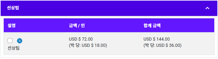 • 선상팁은 객실담당 직원 및 식당 서비스 직원들을 위해 지불하는 금액으로 탑승전 사전 결제 또는 탑승 후 결제 두 가지 방식으로 진행됩니다. 미리 사전결제 하고자 하신다면 선상팁 항목에 체크하시면 됩니다.