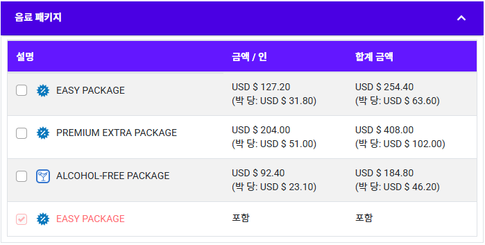 • 요금옵션에서 음료패키지 포함으로 예약하신 경우 자동으로 이지패키지에 포함으로 표시되니 다른 옵션을 선택하실 필요 없습니다.