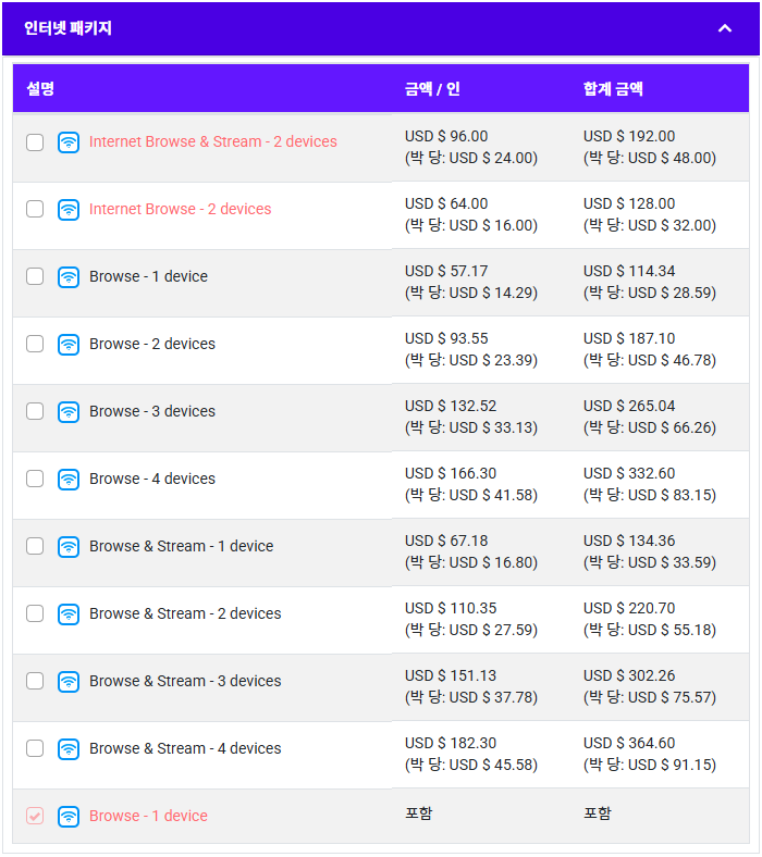 • 음료+와이파이 포함 요금 – 위 음료 포함 요금에 와이파이가 포함된 옵션입니다. 와이파이는 인터넷 브라우즈(Internet Browse) 상품이 1, 2번 승객에게 1개 기기씩 제공됩니다.
