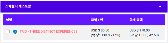 • ​Trio는 스페셜티 레스토랑을 3회 체험할수 있는 패키지입니다.(세곳의 스페셜티 레스토랑에서 별도의 체험메뉴를 주문하실 수 있습니다.)