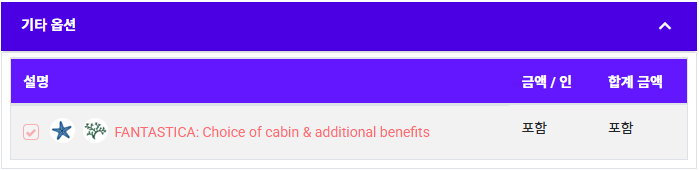• 기타 옵션은 객실 옵션에서 선택한 벨라/판타스티카/아우레아 경험이 자동 체크됩니다.