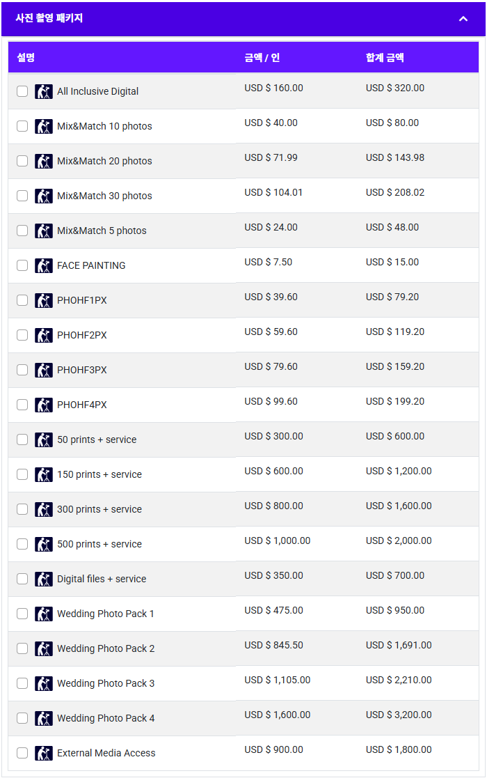 • (0) prints + service – 지정된 수량만큼 인화된 사진 제공 + 촬영 세션(전용 포토그래퍼와 별도로 진행하는 촬영) 포함(단체고객용)
