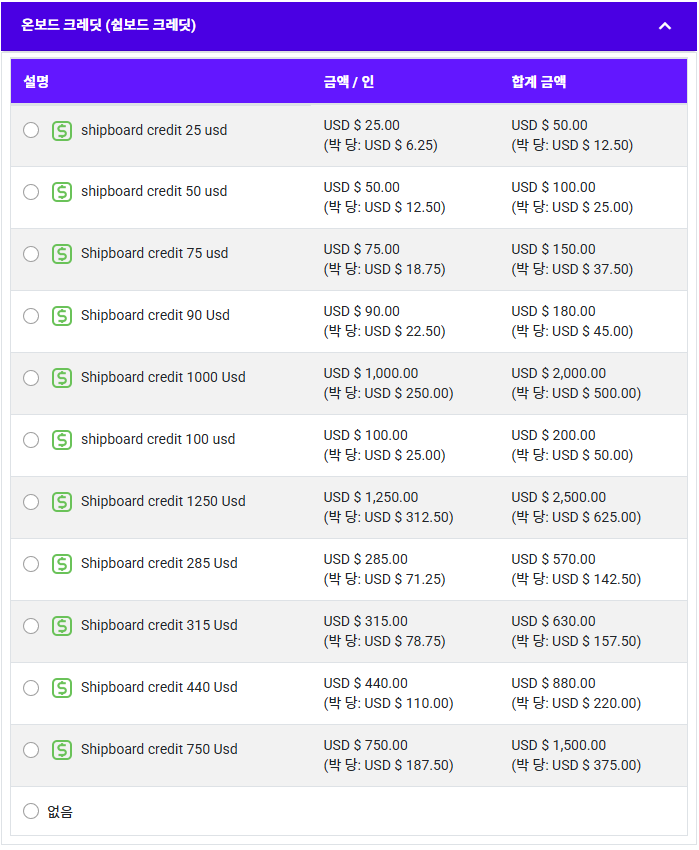 • 온보드 크레딧은 배에서 사용 가능한 현금성 크레딧을 구매하는 옵션입니다.