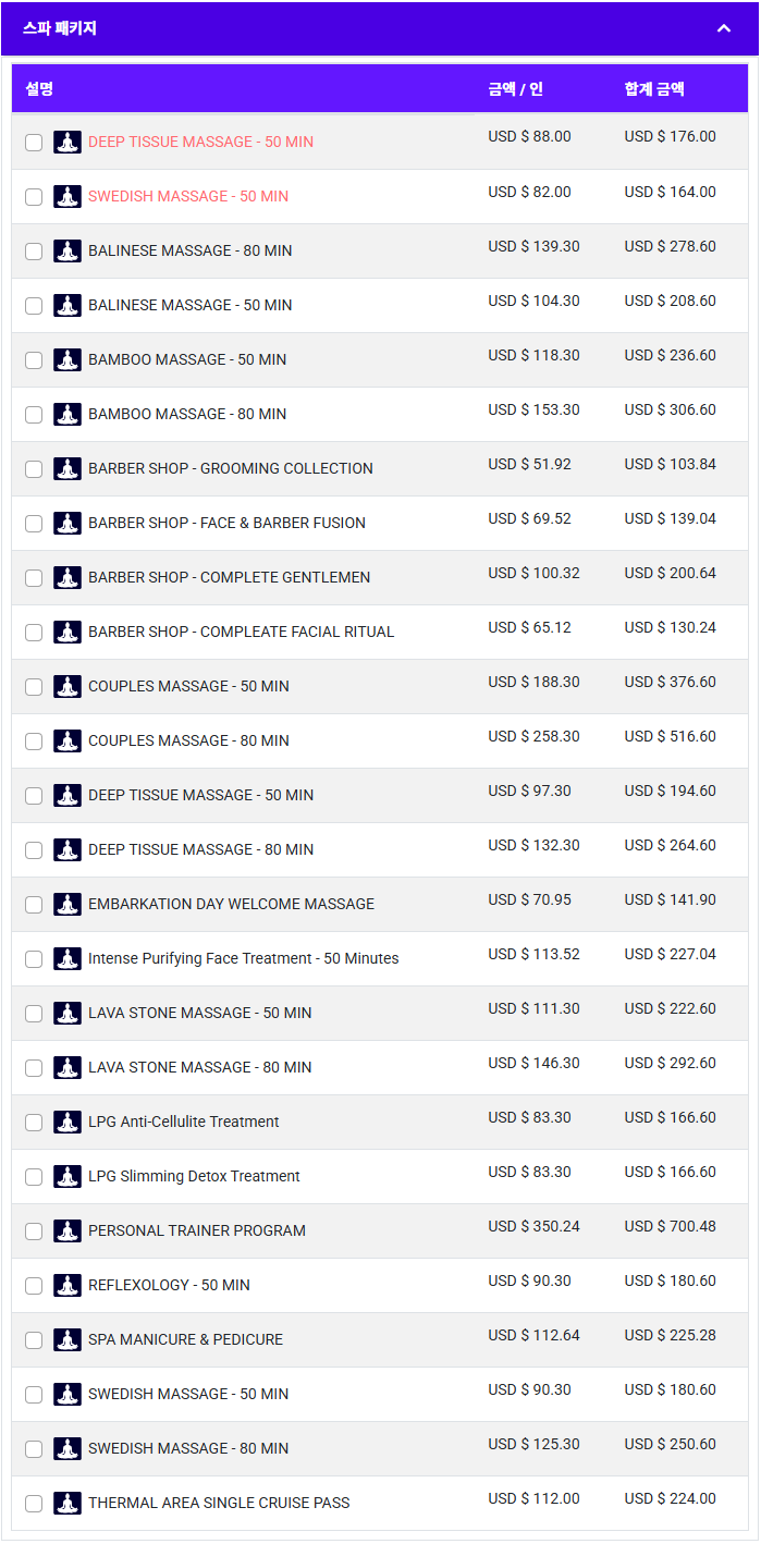 • 크루즈에서 제공하는 마시지 서비스는 매우 비싼편입니다.