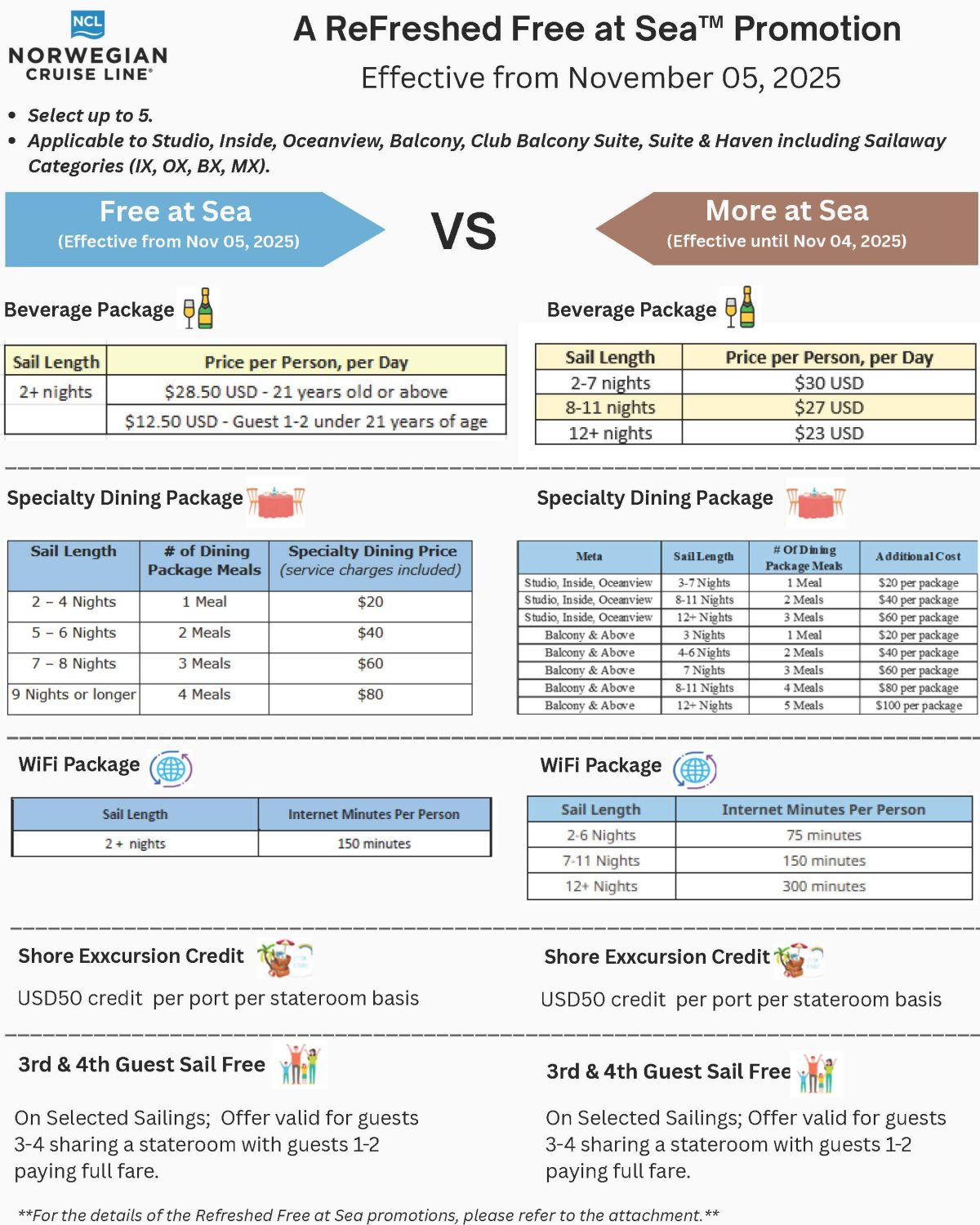 NCL 패키지 혜택 명칭이 다시 MORE AT SEA(MAS)에서 FREE AT SEA(FAS)로 변경되었습니다.