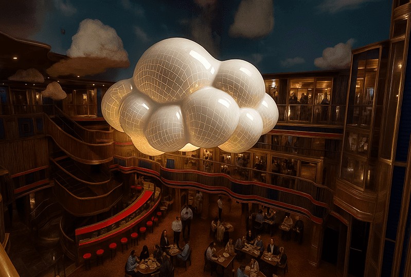 - 萬神殿大廳:挑高十層、懸掛3D雲朵燈光裝置,光影流轉間展現神話意象。