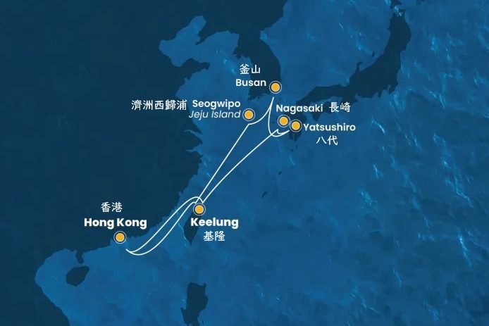 香港 → 基隆(台灣) → 濟州島(韓國) → 釜山(韓國) → 八代(日本) → 長崎(日本) → 香港