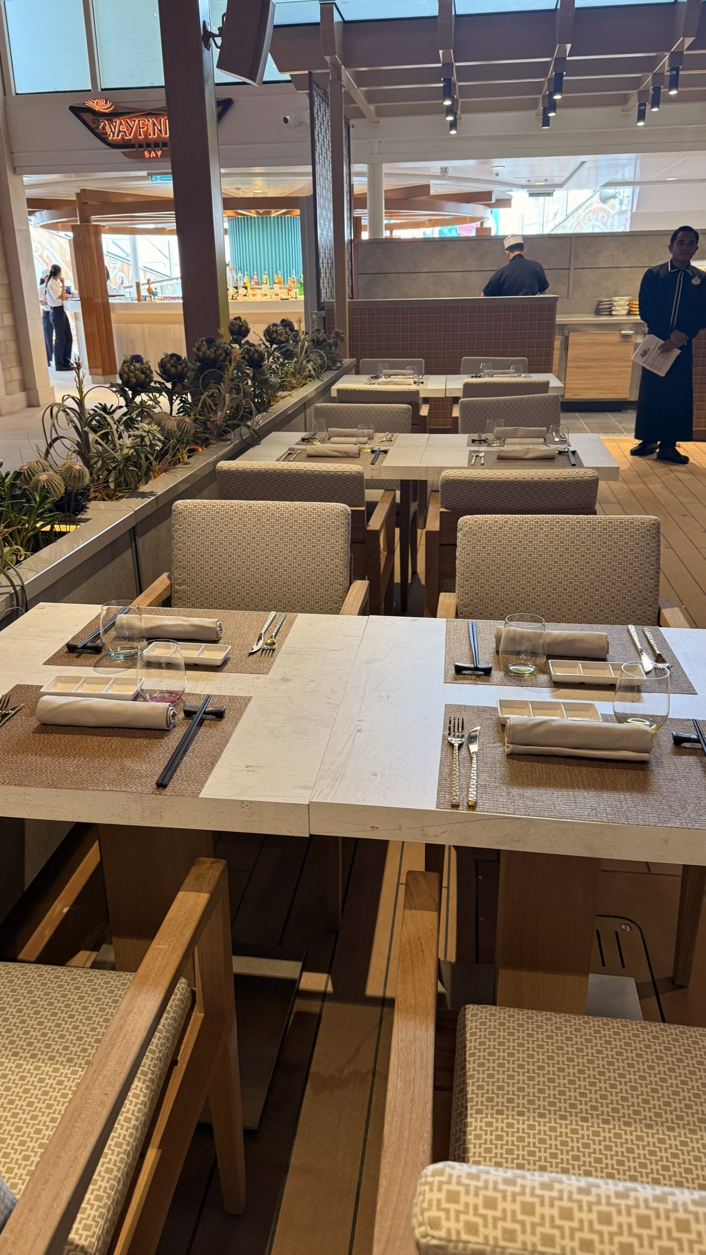 Disney Adventure 的餐飲系統延續了迪士尼郵輪獨有的「輪替餐廳制度」(Rotational Dining),但在這艘船上規模更大——六間輪替餐廳分成三對姊妹餐廳,服務生會全程跟著你換餐廳,讓他們在三晚內完全熟悉你的飲食習慣,不需要重複說明。