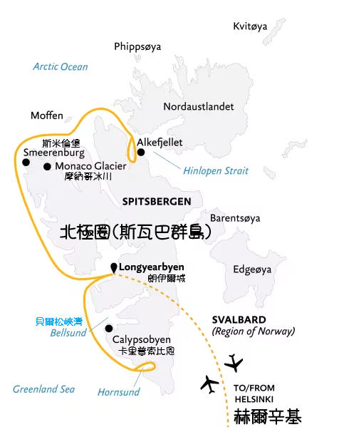 路線流向: 抵達赫爾辛基/雷克雅維克 ➔ 搭乘包機飛往斯瓦巴朗伊爾城/格陵蘭偏遠機場 ➔ 登船探索偏遠高緯度地區 ➔ 搭機返回歐洲大陸。