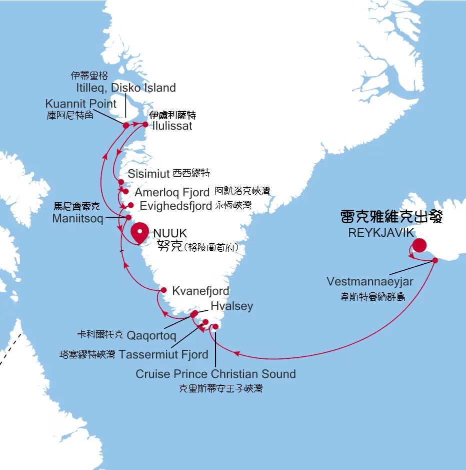 路線流向: 抵達起航港口 ➔ 登船啟航 ➔ 斯瓦巴/格陵蘭沿海區域巡航與登陸 ➔ 環島或沿海岸線返回起航港口。