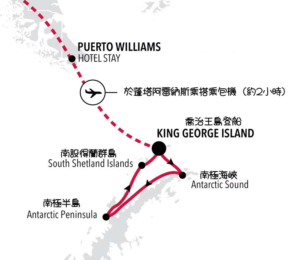 路線流向: 蓬塔阿雷納斯 (搭乘包機 2 小時) ➔ 飛抵南極喬治王島 (King George Island) ➔ 登船 ➔ 南極半島深度巡航 ➔ 返回喬治王島搭機 ➔ 飛回蓬塔阿雷納斯。