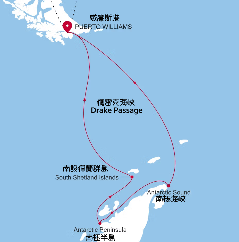 路線流向: 啟航 ➔ 穿越德雷克海峽 (約 2 天) ➔ 南設得蘭群島 ➔ 南極半島 (巡航與登陸) ➔ 穿越德雷克海峽回程 ➔ 返港。