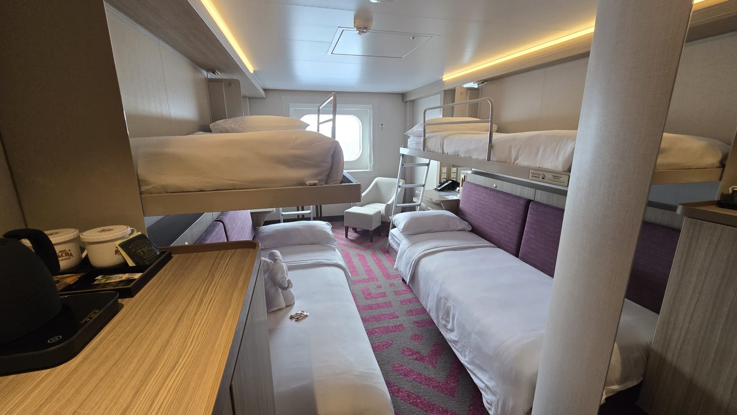 此外,房間內亦有一些細節需要注意。例如上層床(Pullman Bed)一般承重約為 90kg,使用時需特別留意安全;同時切勿同時打開陽台門及房門,否則可能出現強烈對流風,導致物品被吹動甚至飛起。至於收納方面,大部分行李可放置於床底,但整體儲物空間仍然有限,建議簡化行李及善用收納空間。