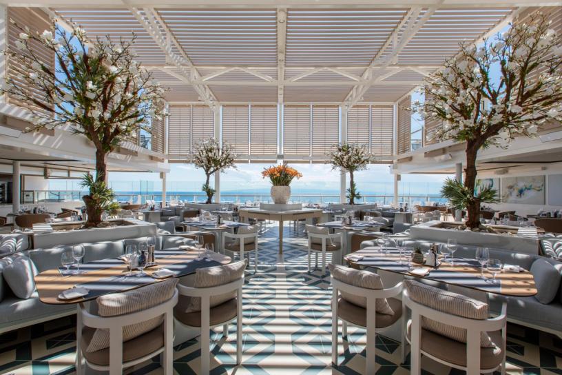 無主餐廳概念: 船上設有多家獨立餐廳,每家都有獨立的廚房和廚藝團隊,提供不同風格料理(如日式、地中海及亞洲風味料理),品質可媲美岸上頂級食府。
