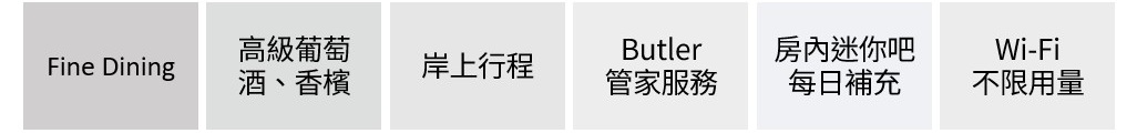 - 行程涵蓋上岸觀光、高級葡萄酒與烈酒、Fine Dining、Wi-Fi、洗衣服務