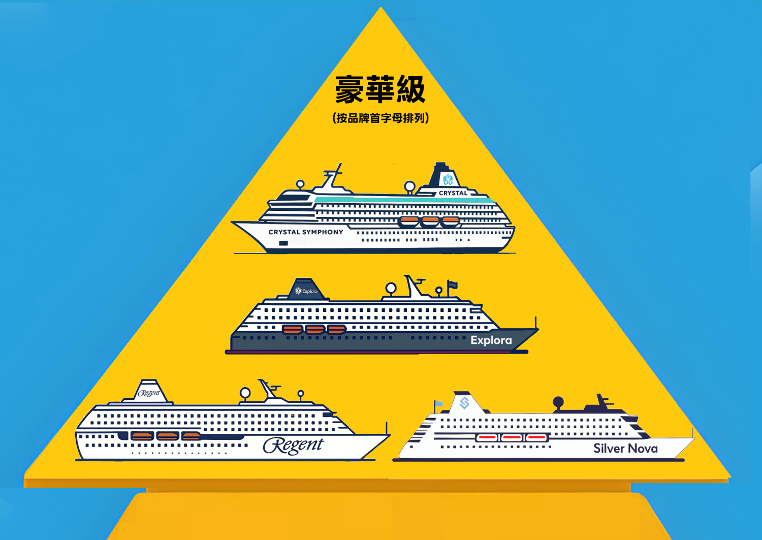 Silversea Cruises(銀海郵輪)、Crystal Cruises(水晶郵輪)、Regent Seven Seas(麗晶七海郵輪)、Explora Journeys(意鉑郵輪)。